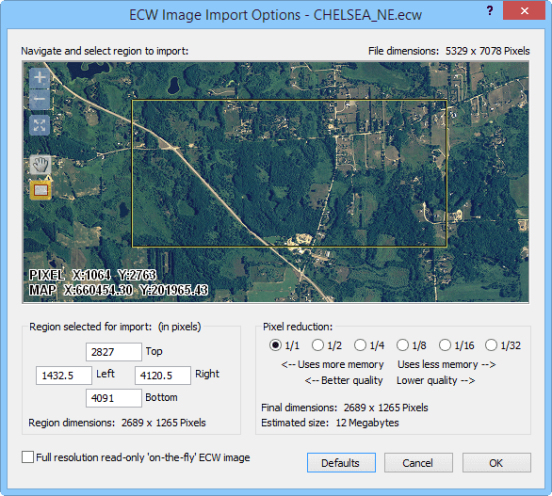 Since some ECW images can be extremely large once expanded into memory, the import filter allows the image to be reduced in dimensions by 1/2 to 1/32 of the original size via the options in the ECW Image Import Options dialog. Choose from 1/1 (Uses the most memory, best quality), 1/2, 1/4, 1/8, 1/16, to 1/32 (Uses the least memory, lowest quality). The Final dimensions field displays the final dimensions of the imported region. The Estimated size field displays the estimated image size in Megabytes (MB).