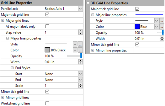 Grid line properties define both major and minor tick grid lines for the selected axis. If the selected plot is a 3D plot, grid lines can be defined for the 3D plane. To expand the properties sections for grid lines, check the box next to Major tick grid line and Minor tick grid line. The properties available will be specific to the type of plot.