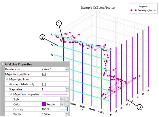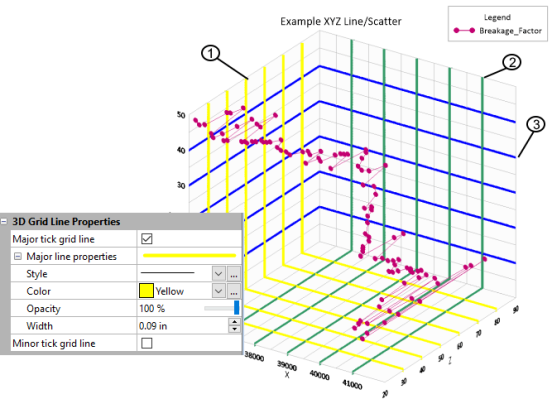 The following is an example of 3D grid lines and the property settings for the Z major grid line (exaggerated for illustration purposes). 3D grid lines are shown on the 3D plane, perpendicular to the selected axis.
