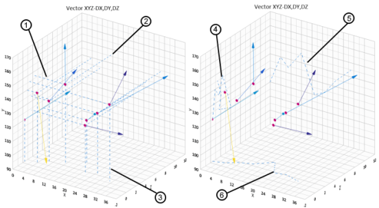 3D XYZ plots have vertical, horizontal, and Z drop line options. When the box next to the Vertical drop lines option is checked, lines are drawn from the points to the bottom wall (XZ plane). When the box next to the Horizontal drop lines option is checked, lines are drawn from the point to the side wall (YZ plane). When the box next to the Z drop lines option is checked, lines are drawn from the point to the back wall (XY plane).