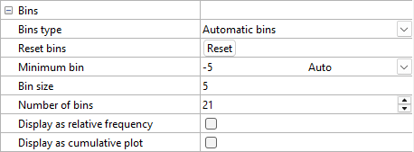 Click the Reset button in the Reset bins field to reset the automatic bins to the default values based on the data. This action will revert the Minimum bin, Number of bins, and Bin size to values that are automatically calculated based, in part, on the range specified by your data limits.