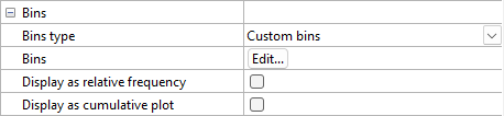 Histogram bins can be automatic or custom. Automatic bins use the values in the Minimum bin, Number of bins, and Bin size options to determine the starting bin value, how many bars are displayed, and the bin size of each bar. To change the Bins type, click on the existing option. In the list, select the desired option.