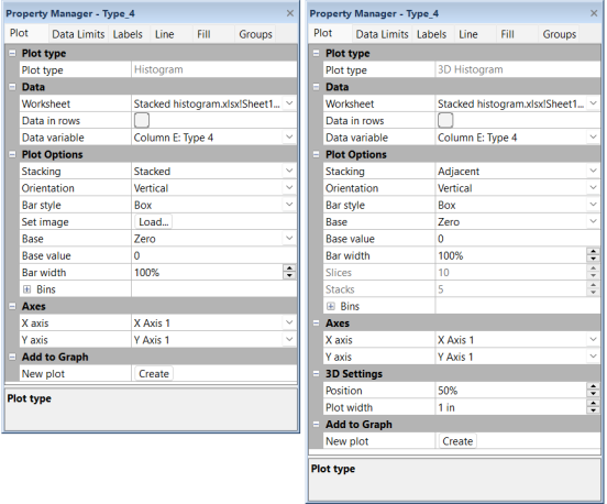 The Plot Options properties group includes the main display options for the histogram. Multiple histograms can be displayed in a single graph as a plot group. The following properties are shared among all histograms in a single group: Stacking, Orientation, Base, Base value, Bar width, and all Bins properties. When a shared property is changed for one histogram, all other histograms in the group are updated to the new value.