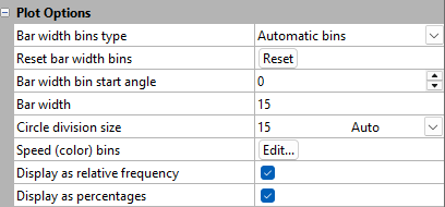 The Bar width bin start angle property shows the beginning number for the first bin. This value is in degrees. By default, this value is 0. By changing the starting location, you can create a bin which overlaps the 0 degree direction. For example, if you are using bins 20 degrees in size, setting the Bar width bin start angle value to 10 degrees results in the final bin covering the arc from 350 to 10 degrees.