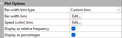 The wind chart plot properties Plot page contains the options to change the data file, set the bin size, set the wind speed bins, and set bar properties. To view and edit wind chart plot properties, click on the wind chart plot in the plot window or Object Manager to select it. Then, click on the Plot tab in the Property Manager.