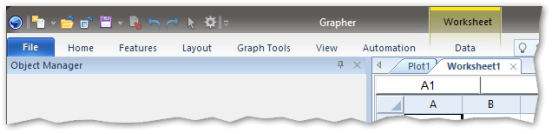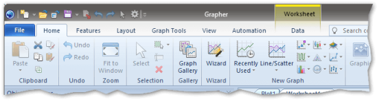 The Ribbon is the strip of buttons and icons located above the plot, worksheet, and grid windows. The Ribbon replaces the menus and toolbars found in earlier versions of Grapher. The ribbon is designed to help you quickly find the commands that you need to complete a task.