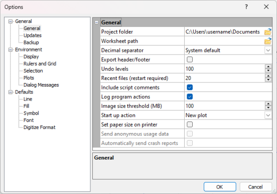 The General section has the following sub-sections: General, Updates, and Backup. Click General on the left side of the dialog to display the General options on the right side of the dialog. Use the General options to control general preferences in Grapher.