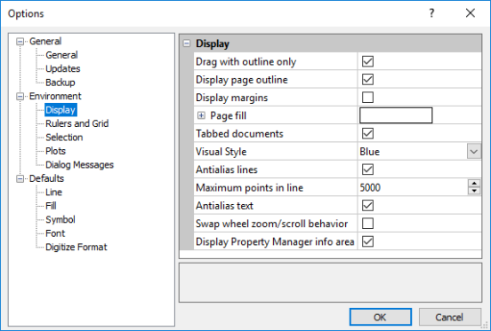 Use the Display page outline option to display or hide the page outline in the plot window. Check this option to display the page outline. Uncheck this option to hide the page outline. The page size is set through the File | Page Setup command.