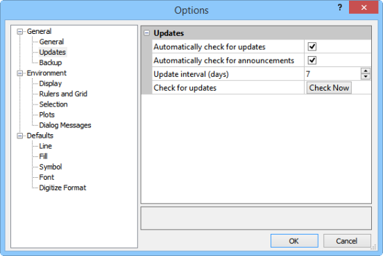 An update is a free newer version of the program. Updates include corrections to problems that have been found. Check the Automatically check for updates box to allow Golden Software to check for program updates (e.g., Grapher 18.0 to Grapher 18.1) according to the user defined time interval. Additionally, if a crash occurs while the program is running, a check for update will occur the next time the program is started.