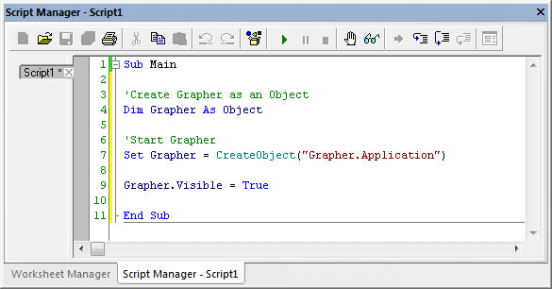 Code is immediately added to the Script Manager when script recording begins. This information starts Grapher when the script is run later. The text in green with an apostrophe prefix are comments. |