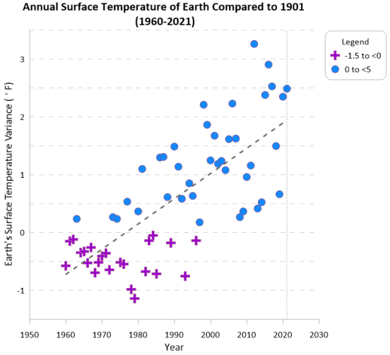 Horizontal and vertical lines can visually highlight specific points along your X and Y axes. In this example, we will add a vertical line to indicate the last data point (2021) and a horizontal line to emphasize the baseline temperature of 1901 (0).