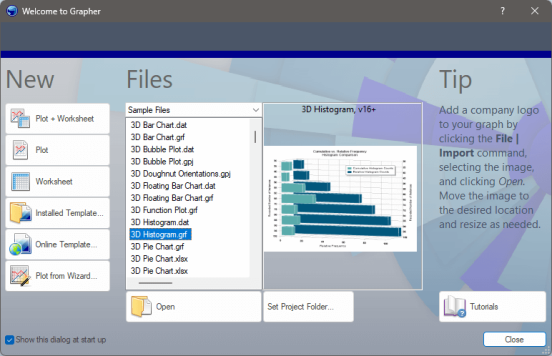 The Welcome to Grapher dialog is displayed each time you start Grapher. The Welcome to Grapher dialog provides immediate access to the new Plot + Worksheet, Plot, Worksheet, Template Gallery, Online Template, and Plot from Wizard commands; sample files, recent files, and project files; as well as the tutorial.