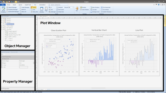 In summary, the Plot Window houses your Grapher project. Each object in the project can be selected and arranged in the Object Manager and once selected, the object properties can be adjusted in the Property Manager.